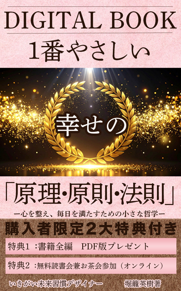 “幸せは、どこか遠くにあるものではなく、あなたの『内側』にあります。この本では、「原理」「原則」「法則」という3つのステップで、誰でも実践できる『幸せの仕組み』をやさしく解説。読むたびに心が軽くなり、日常の中で自然と笑顔が増えていく——。小さな気づきが、大きな幸福を呼び込むヒントになるでしょう。あなたの人生をやさしく整える、癒しの一冊です。”